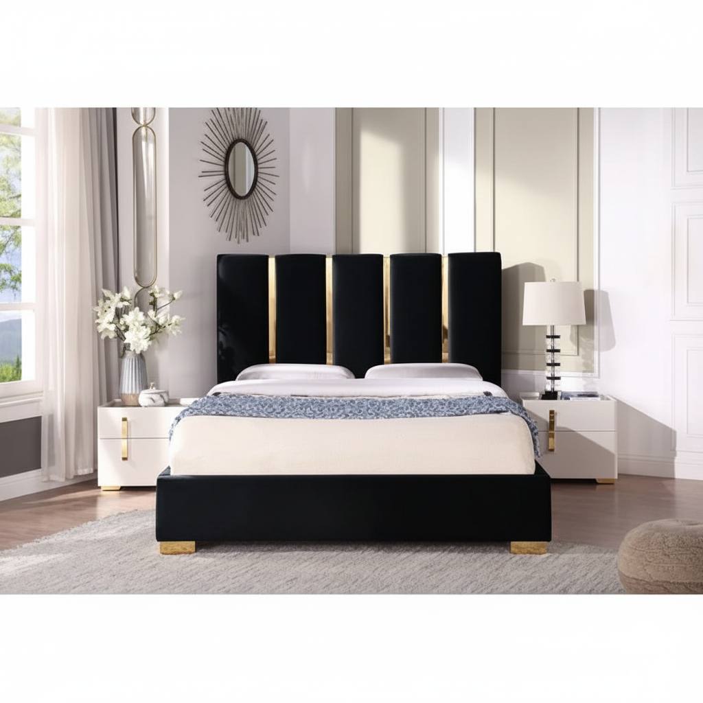 Luxury Black & Gold King Size Bed – Upholstered High Headboard, Sleek Metal Legs