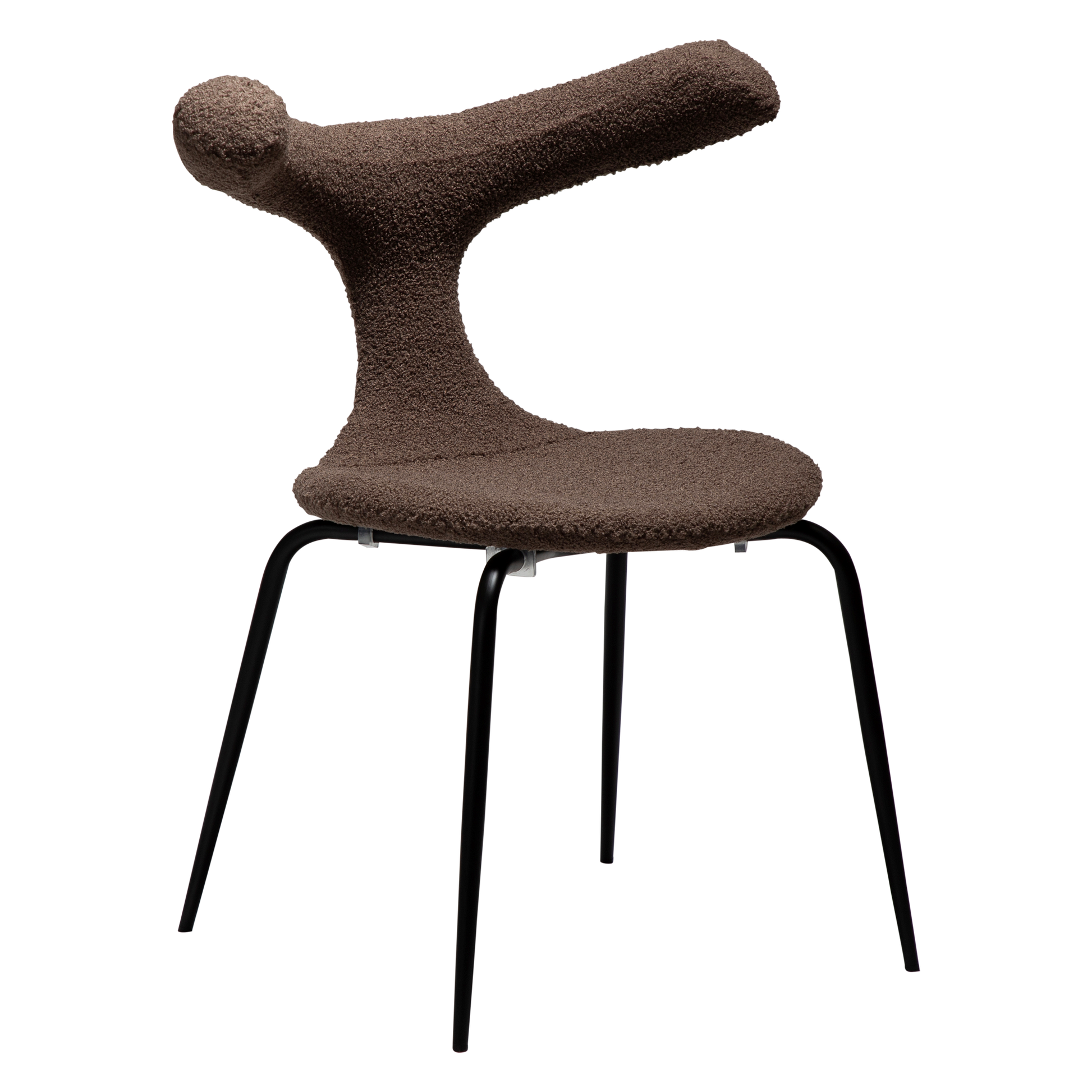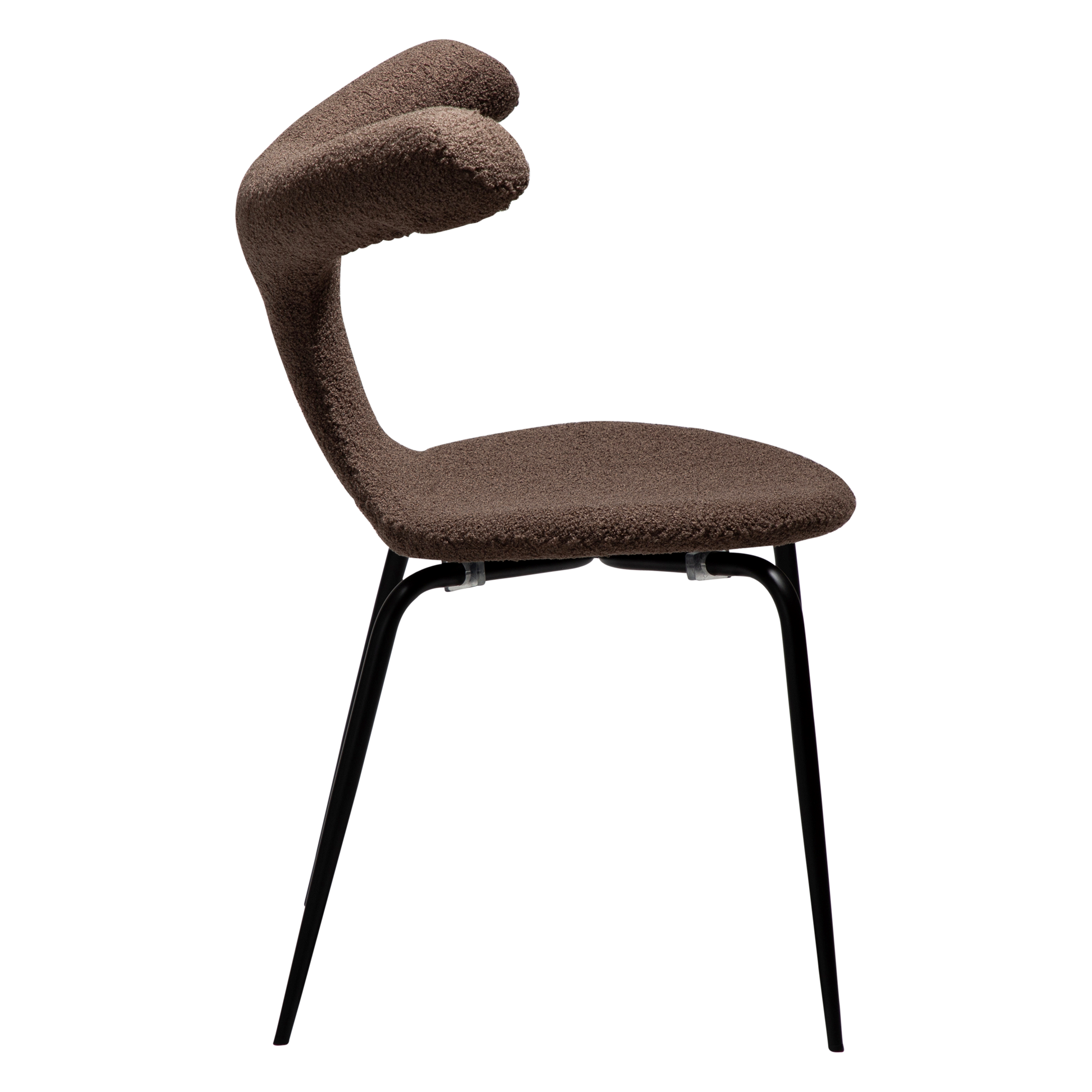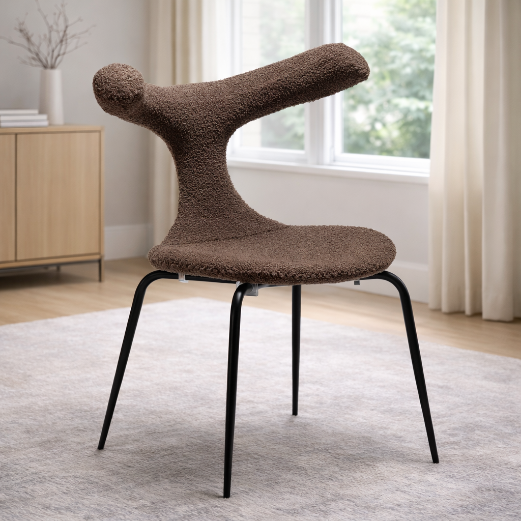 - Textured Fabric: Covered in a plush, tactile material like bouclé or faux-shearling in a dark charcoal or chocolate brown tone, adding warmth and visual depth.