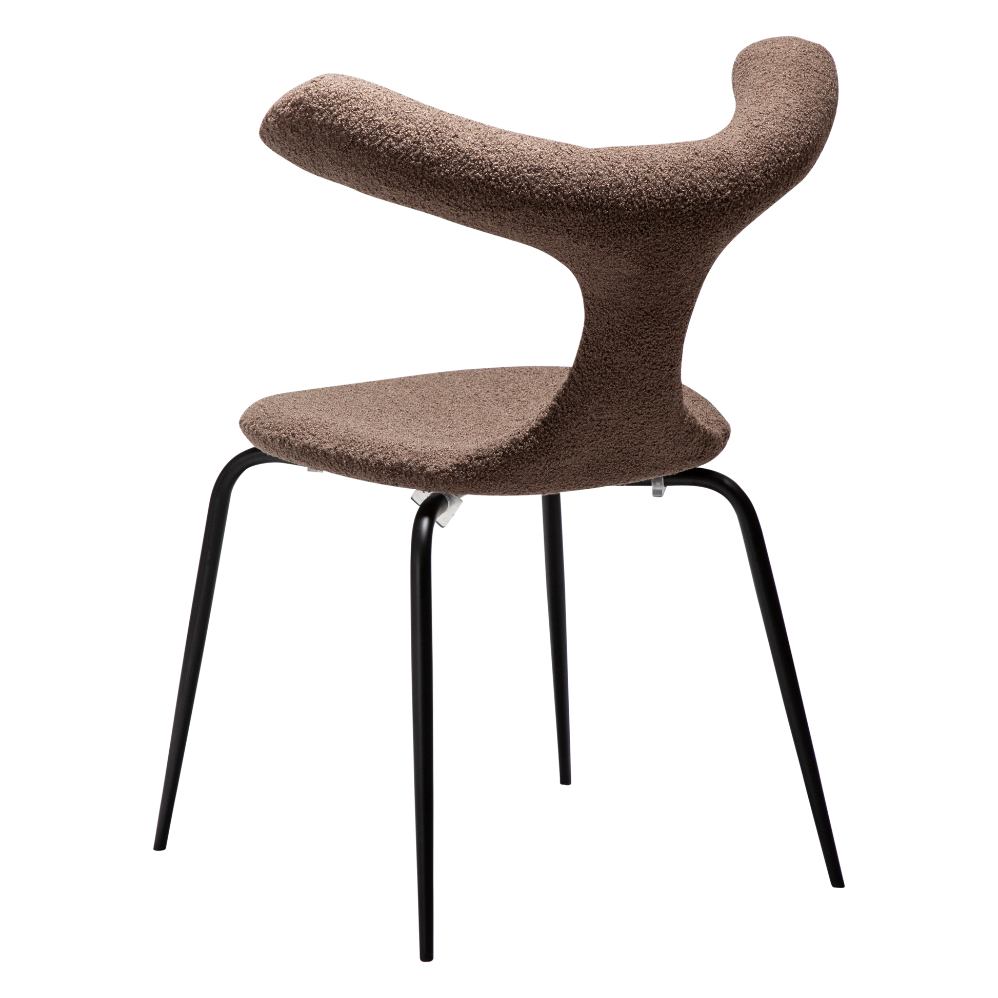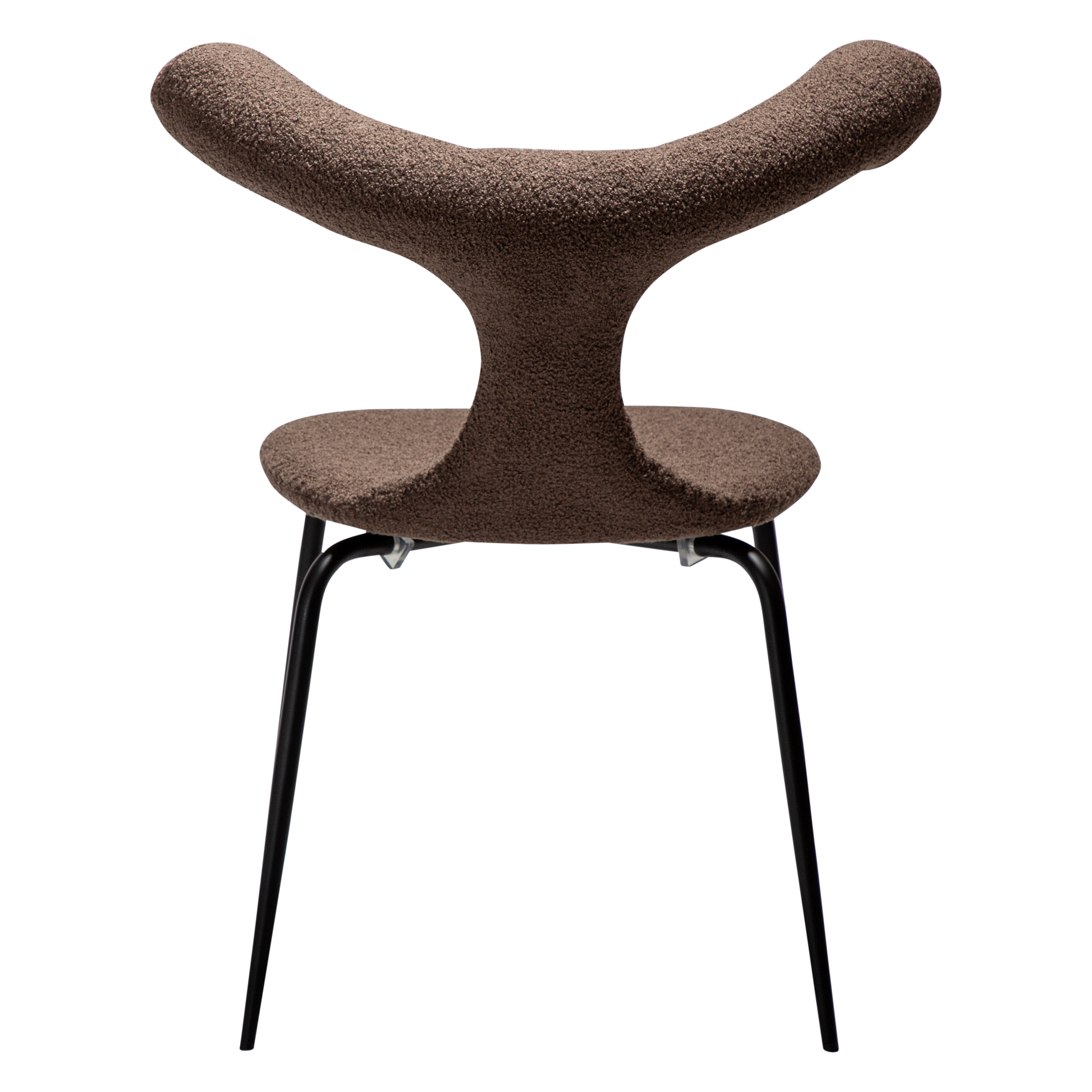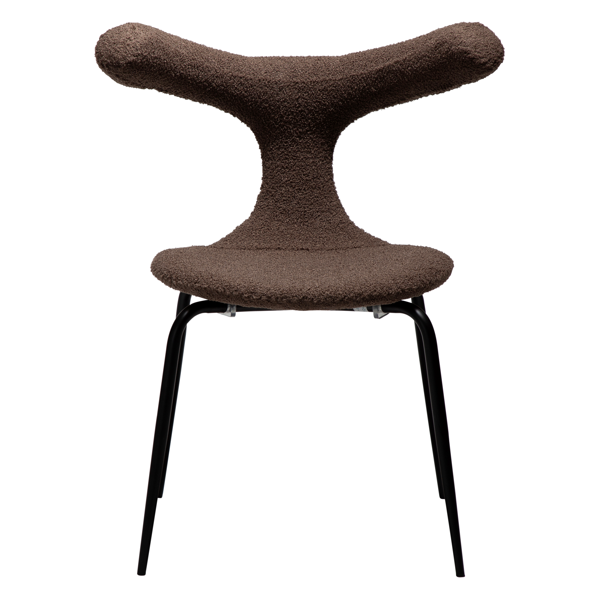 - Textured Fabric: Covered in a plush, tactile material like bouclé or faux-shearling in a dark charcoal or chocolate brown tone, adding warmth and visual depth.