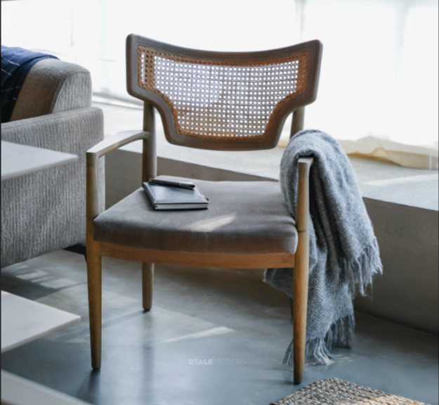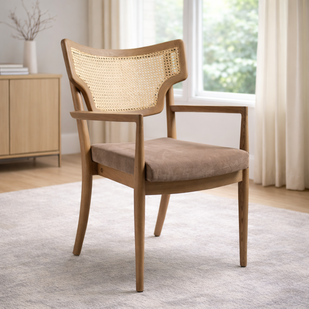 Woven Cane Backrest: The wide, winged backrest features a beautifully inset panel of natural woven cane (rattan), offering both breathability and a timeless texture.