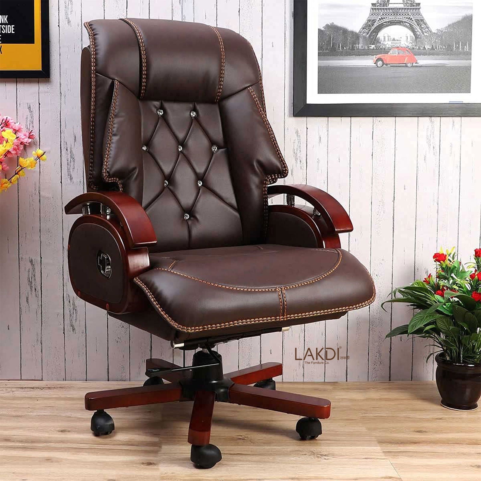 High Back Leatherette and Pure Leather Wooden Director Office Chair with Wooden Base and Handle, Wooden chair