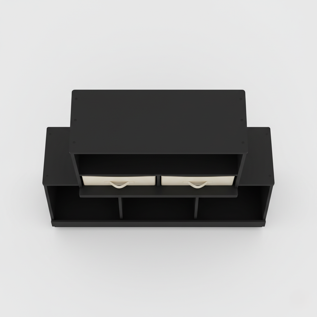 - Colour Combination: Black outer frame with neutral beige fabric drawers