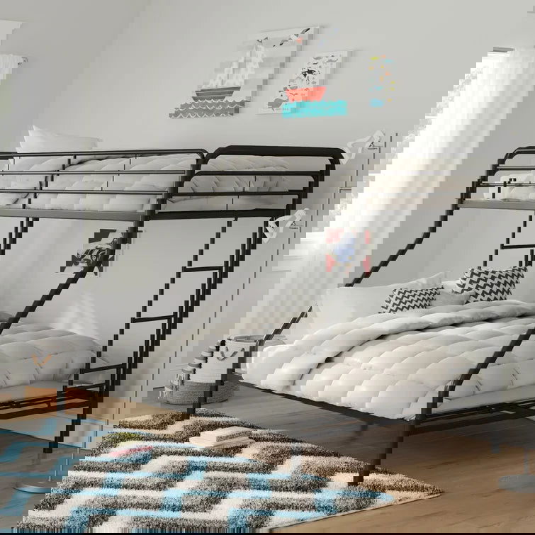 Material: Twin over full metal bunk bed. This simple, yet contemporary twin over full bunk bed conveys chic style with its clean lines. The sturdy, steel-crafted frame promises long-time stability and durability, and gives a stylish modern looking crafted with durable steel frame. Designed with safety in mind, this bunk bed includes sturdy and secured ladder beside and solid safety rails on top bunk. The bunk bed meets all safety standards and we promise its quality. It is adult assembly required. Do not miss the chance to add this striking contemporary bunk bed to your lovely home.