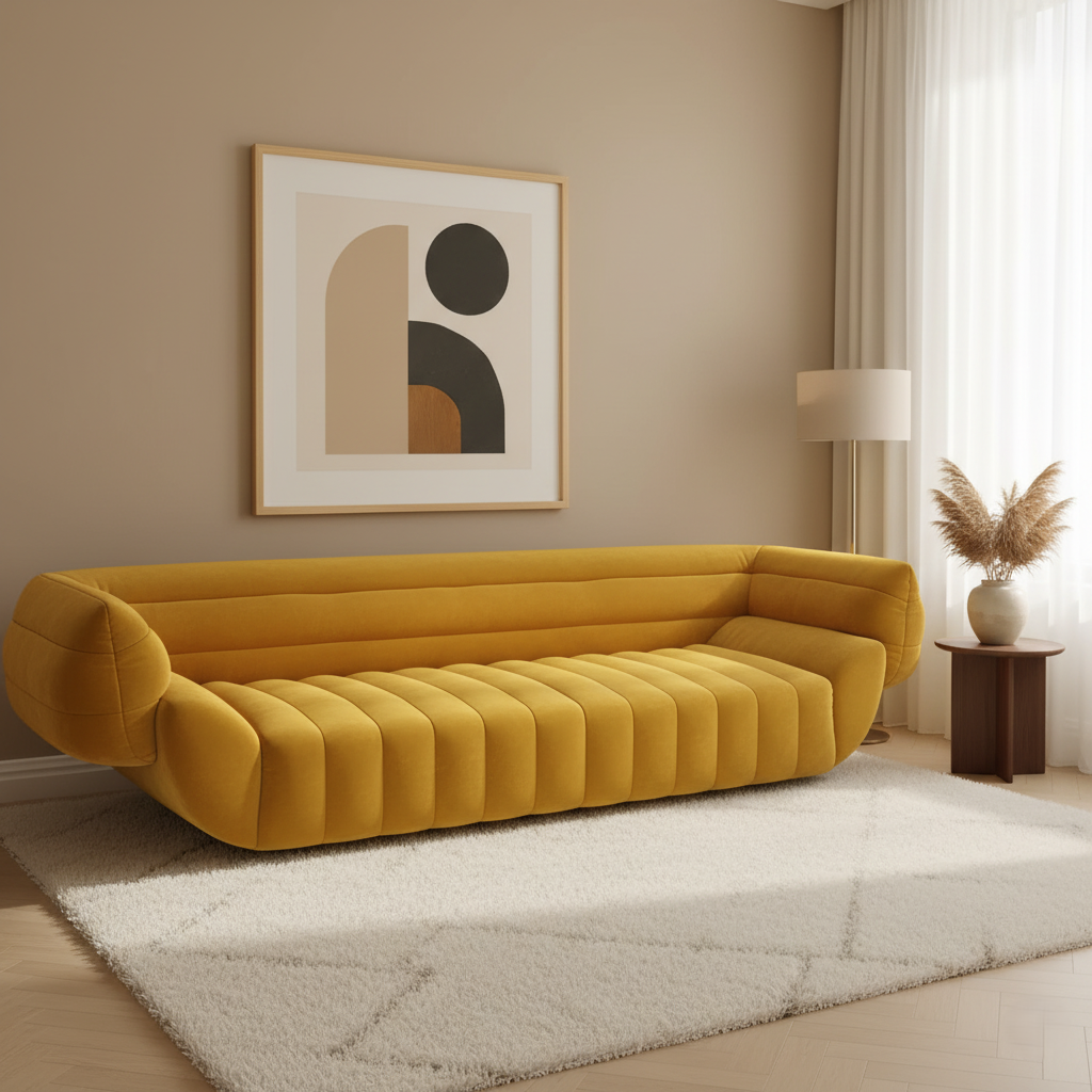 Material: Inbuilt with a solid Marandi wood, plush high-density foam cushions, and upholstered fabric.