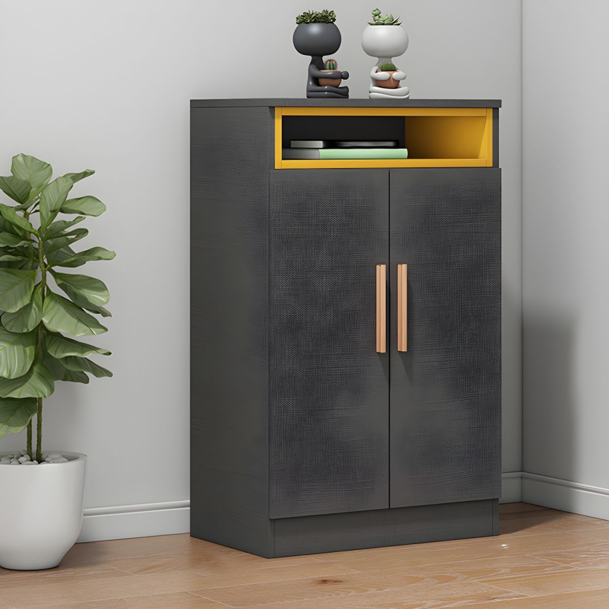 - Colour Combination: Dark grey exterior with contrasting mustard yellow open shelf interior
