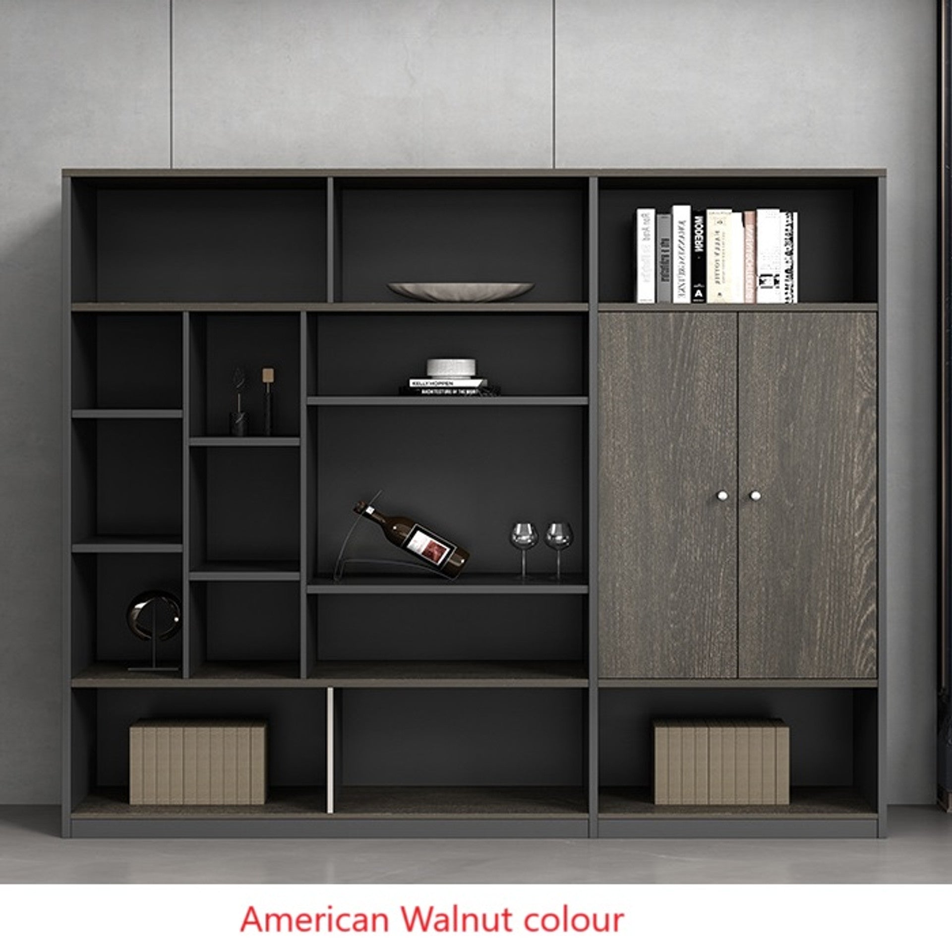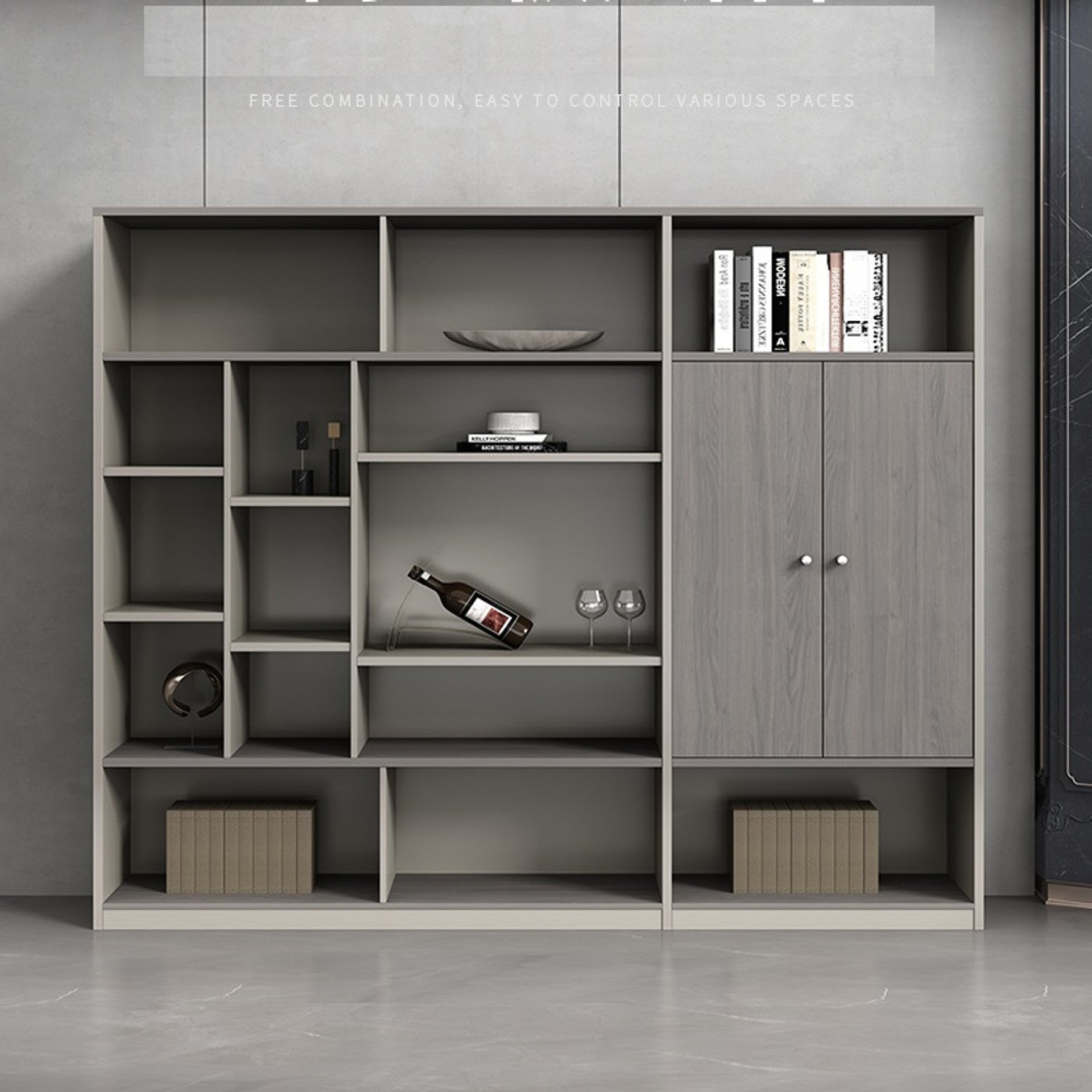 Feature:-Spacious wooden cabinet with open shelves and closed doors, elegant grey finish, perfect for office or corporate organization for books and other essentials