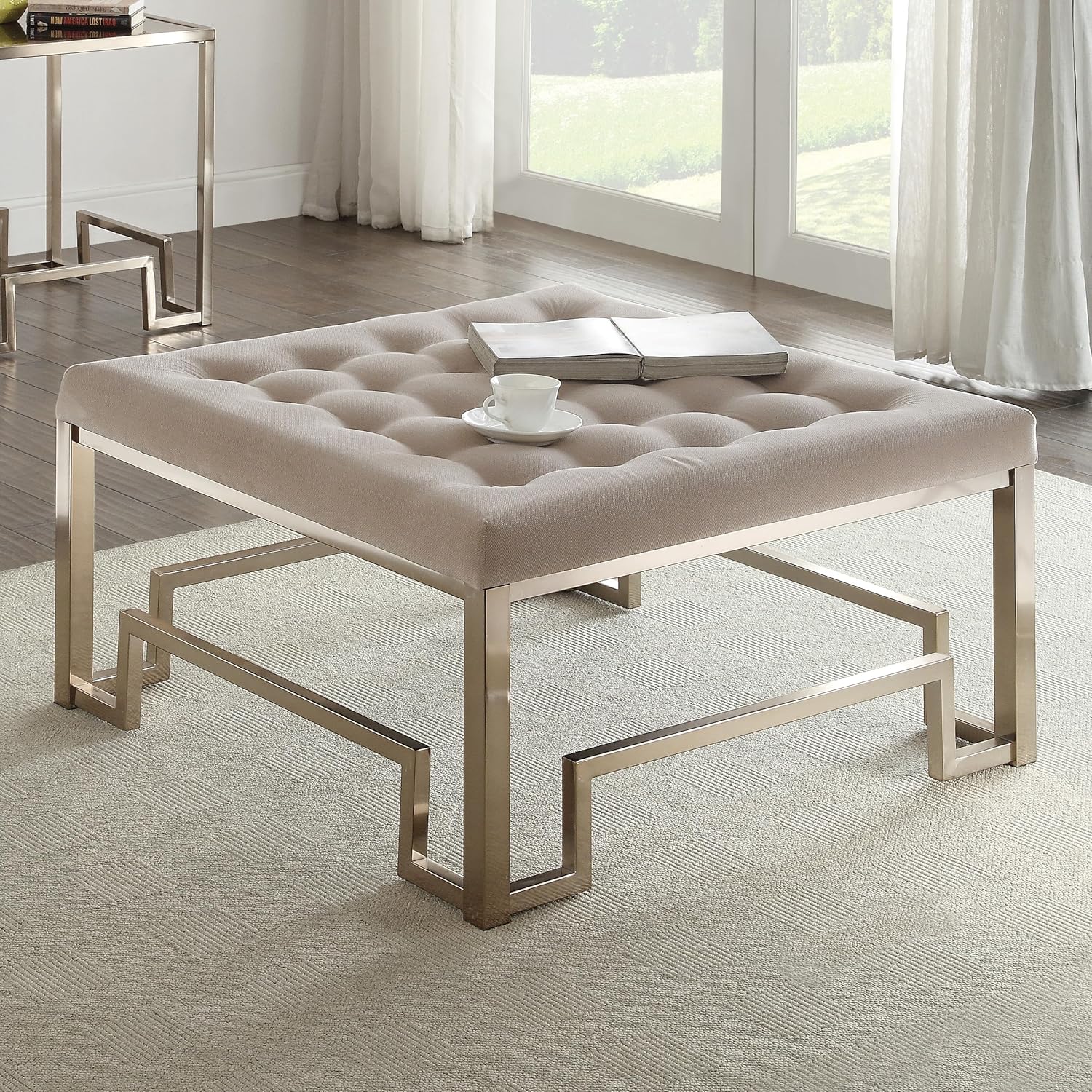 Modern Tufted Square Ottoman Coffee Table with Geometric Gold Metal Base – Elegant Living Room Pouffe