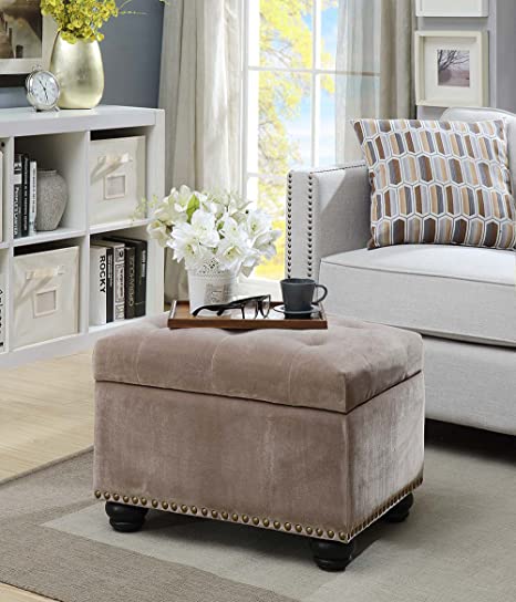 Features: Plush velvet upholstery, deep button tufting, spacious hidden storage, elegant nailhead accents, sturdy dark wood legs.