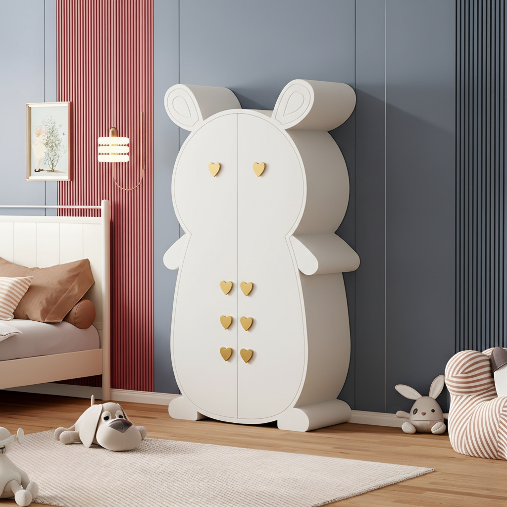 Rabbit Shape Kids Wardrobe with Heart Knobs, White Designer Kids Storage Cabinet for Bedroom