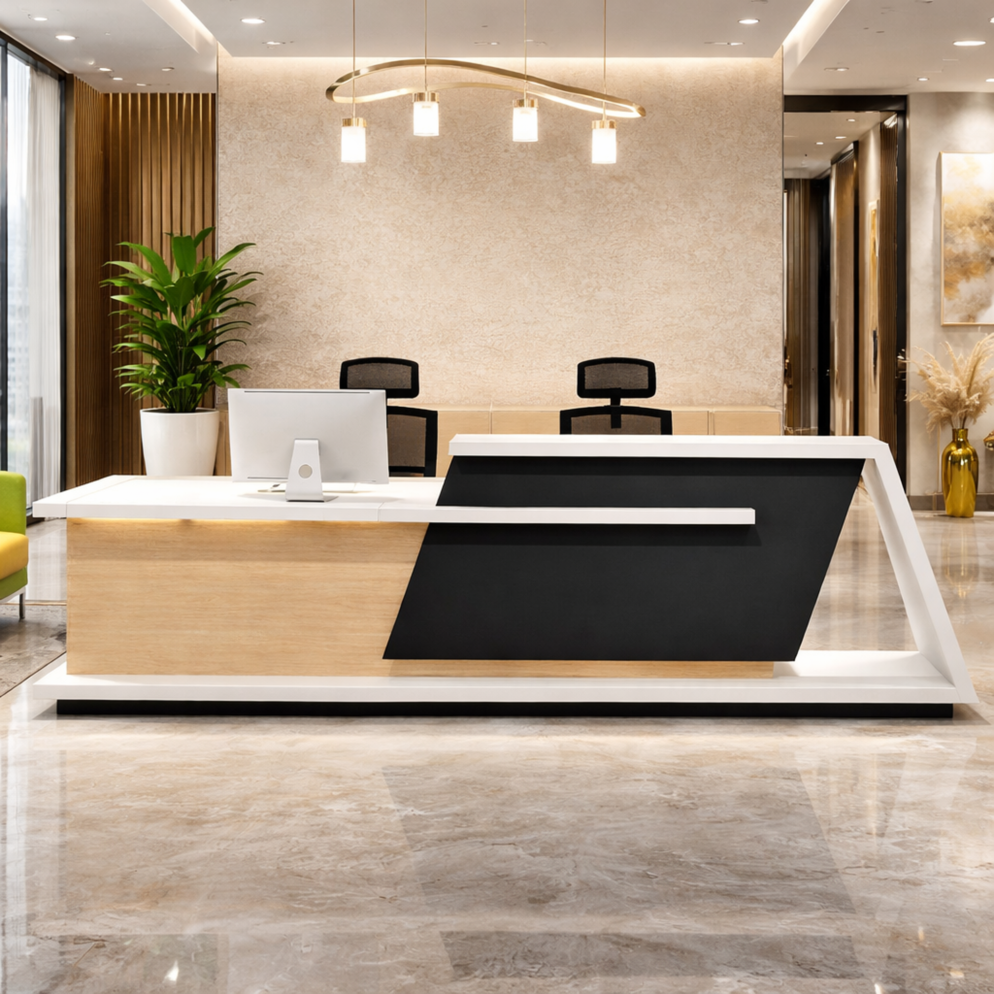Reception table made in Engineered wood and laminate while the inside is in oak wood finish also includes one inbuilt storage pedestal