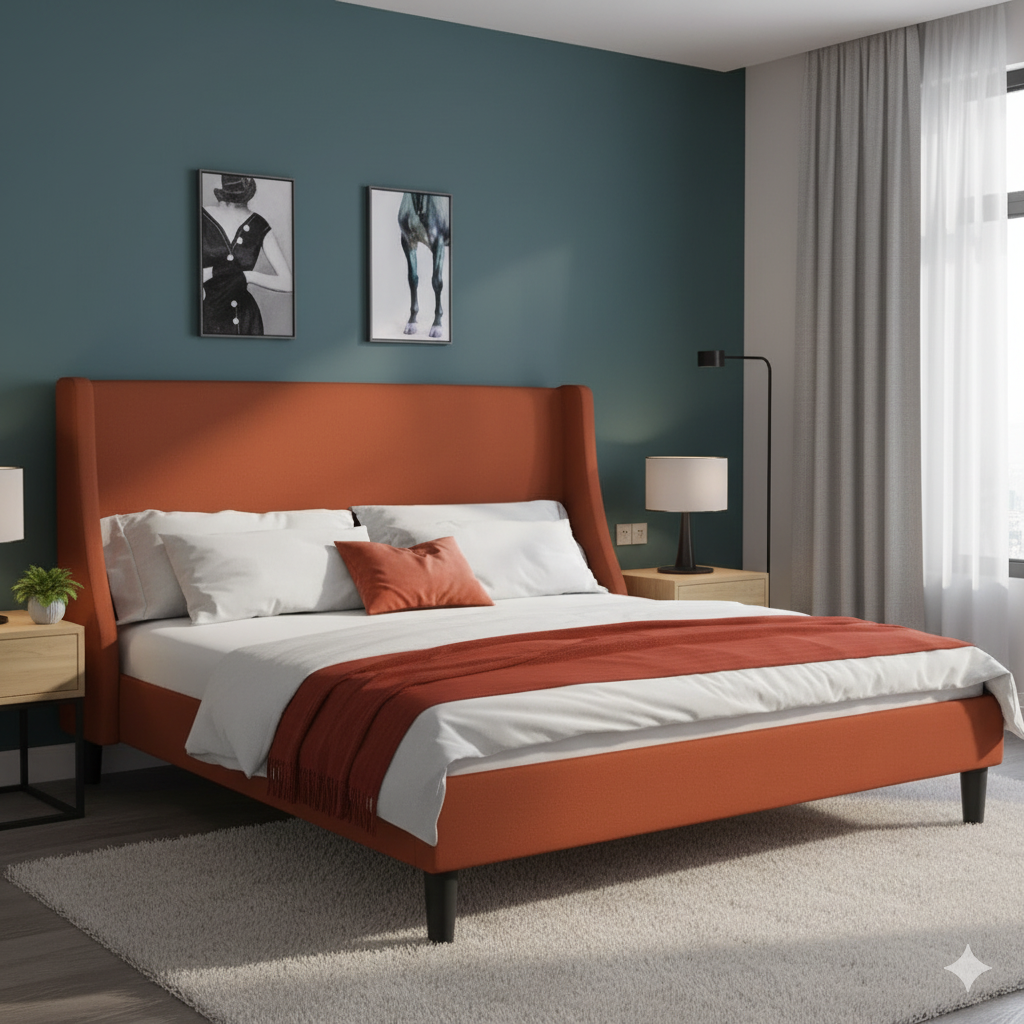 Feature:- Elegant upholstered bed with tall button- plush foam support, durable wood-ply construction, and raised legs for easy maintenance.