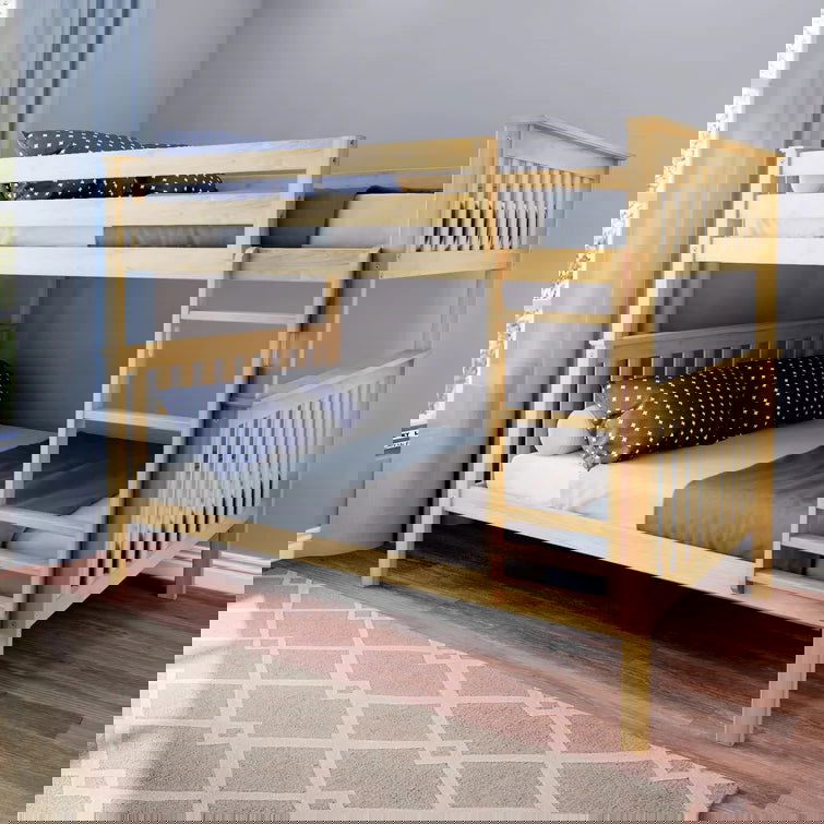 Material: Twin-Over-Twin Bunk Bed is perfect for your home. High-quality Solid Pine Wood Structure and Legs, durable frame ensures stability and durability for long-term use, and Modern Bunk Bed With Built-In Ladder and Guardrail for Kids can be separated into two twin beds. Slat kit included so box springs are not required. This bunk bed is designed with a clean silhouette and a hue of elegance. It suits all styles of home decoration and completes the look of any bedroom.