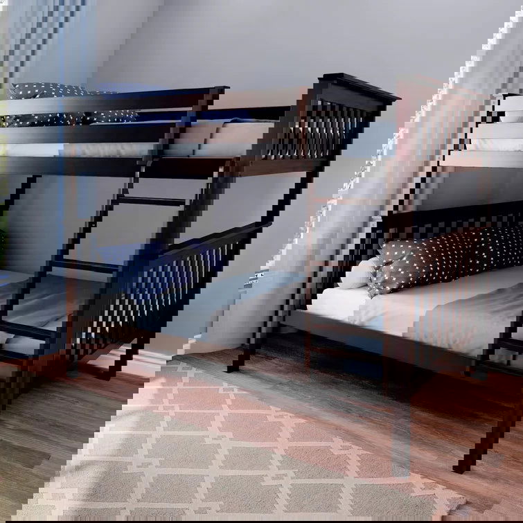 Material: Twin-Over-Twin Bunk Bed is perfect for your home. High-quality Solid Pine Wood Structure and Legs, durable frame ensures stability and durability for long-term use, and Modern Bunk Bed With Built-In Ladder and Guardrail for Kids can be separated into two twin beds. Slat kit included so box springs are not required. This bunk bed is designed with a clean silhouette and a hue of elegance. It suits all styles of home decoration and completes the look of any bedroom.